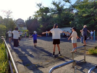 今年はみんなで丸くなって体操していました。朝6時30分からと早い時間ですが、30人近くの子どもたちが参加していました。